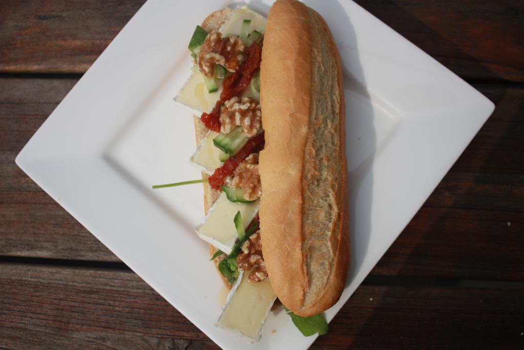 Het broodje wordt belegd met zachte brie, knapperige walnoten, frisse komkommer en zongedroogde tomaatjes, afgewerkt met een vleugje honing.