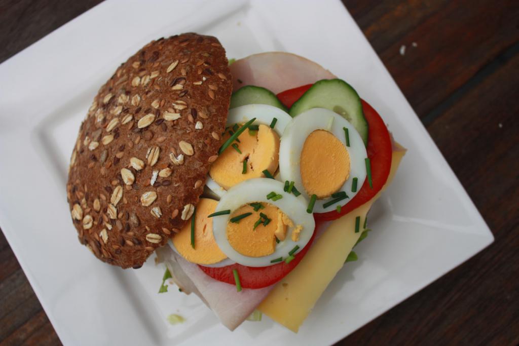 Het broodje wordt belegd met kaas, ham, ei, ijsbergsla, tomaat en komkommer. Licht, voedzaam en altijd een goede keuze.