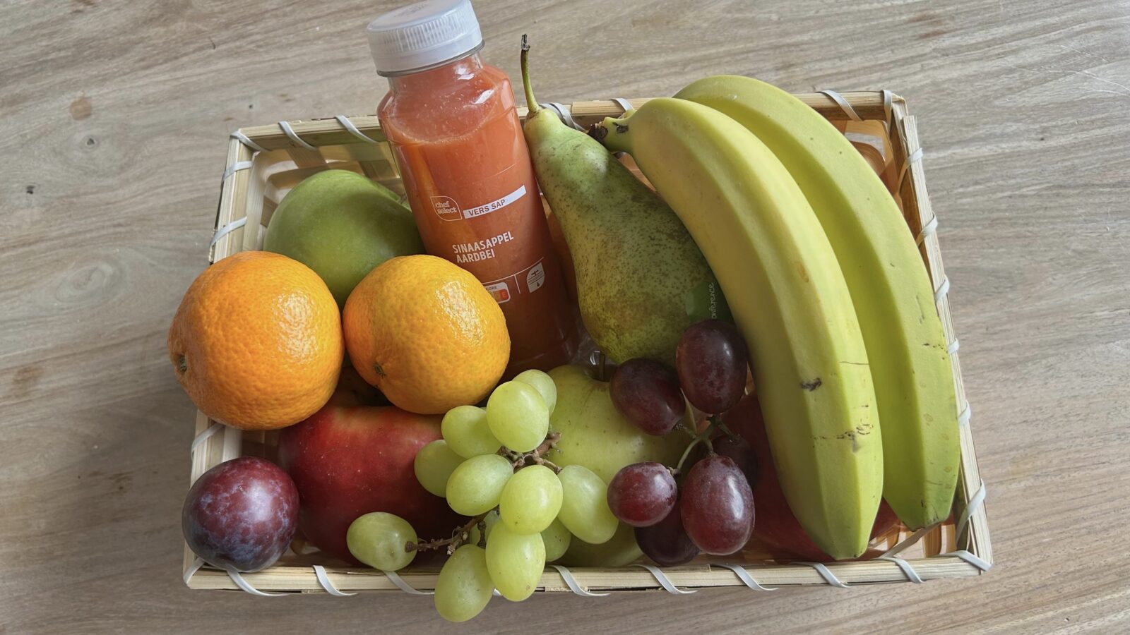 De Fruitmand bestaat uit een gevarieerde selectie vers seizoensfruit. Elk stuk fruit wordt met zorg gekozen op kwaliteit, smaak en versheid. De samenstelling kan per seizoen verschillen, maar is altijd fris, gezond en aantrekkelijk gepresenteerd.